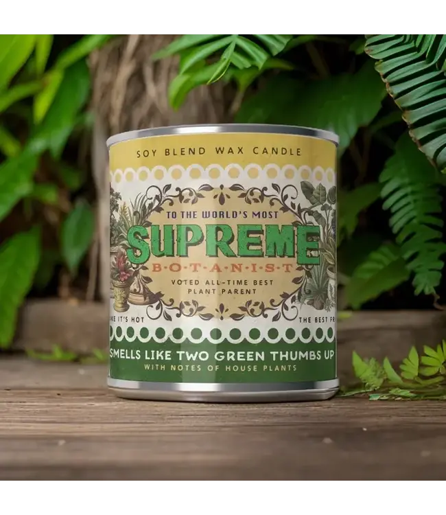 Introducing our Plant Parent 16oz. Candle, a delightful tribute to the green-thumbed genius in your life! The front message reads, "To the World's Most Supreme Botanist; Voted all-time best plant parent," acknowledging their unparalleled gardening skills.